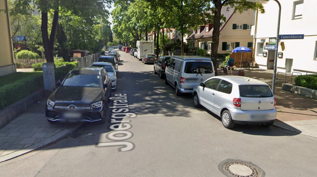 Ein weiteres Beispiel, wie viele hunderte Anwohnerstraßen Münchens ausschauen: die Joergstraße. Einseitig wird auf der Fahrbahn geparkt und auf der anderen Seite illegal auf dem Gehweg.